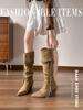 Lederversion! Retro Western Cowboy Stiefel Ödland Fransen Dünne Ritterstiefel Spitz Dick Absatz Blockabsatz