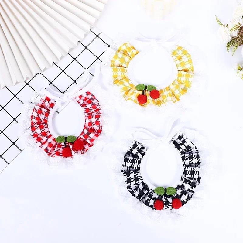 Modisches Kirsch-Halstuch für kleine Hunde, bedruckt, mit Spitze, Lätzchen, verstellbar, kariertes Halsband, Halskette