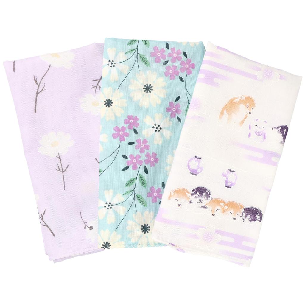 Cluster Tenugui Washed Gauze with Finish and Ranman Flower Pattern Set of Japanese-made (Tenugui) Double-Layered Anti-Fray [Mameshiba (Lavender) / 3]