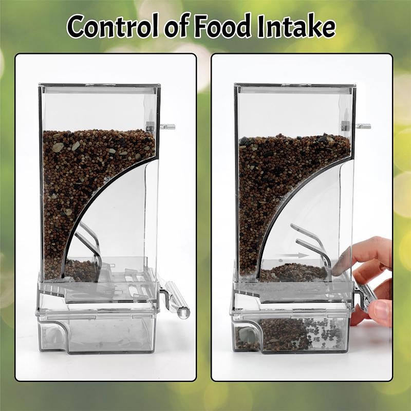5,Hinweis:Der transparente Futterspender passt die Futtermenge an die Essgewohnheiten Ihres Vogels an und verhindert so Über- oder Unterfütterung.; Der Futterspender hat eine 3,9 Zoll x 3,3 Zoll große Futteröffnung, die bei der Verwendung durch den Käfig geführt werden muss, daher muss die Öffnungsgröße des Käfigs etwas größer sein als die Futteröffnungsgröße, um zu verhindern, dass der Futterspender nicht am Käfig montiert werden kann.