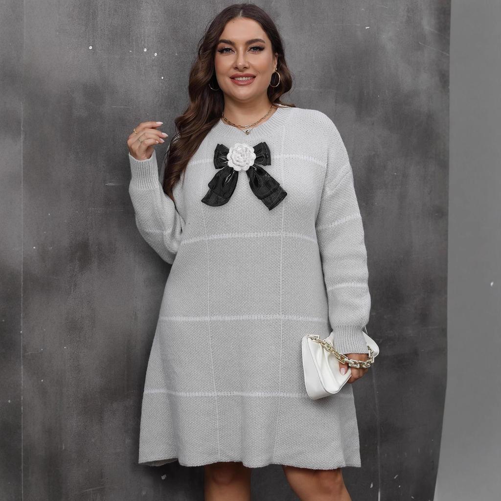 Herbst- und Winterkleid, Pulloverkleid, Übergrößen-Damenkleid mit Streifen, Kontrastfarben, Schleifen und Handhäkelarbeit