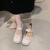 Französische Schleife eckige Spitze kleine Lederschuhe Damen Ein-Wort-Schnalle Rock beige Hepburn-Stil Mary Jane mittlerer Absatz Einzelne Schuhe