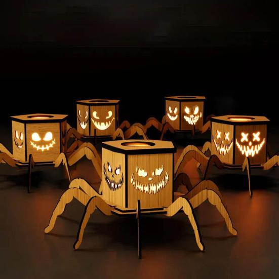 Halloween Leuchtende Kürbislaterne LED Holz Spinne Kürbislampe mit Gruselgesicht für Halloween Party Heim Hof Dekor