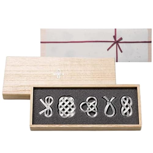 A set of 5 tin chopstick rests with a mizuhiki knot motif. Each chopstick rest is shaped like a happy pattern and is recommended as a present or gift. Tin has antibacterial properties, so you can safely use it as tableware. Also, since it is made of 100% tin, it is soft and can be used in different shapes. It is wrapped in Japanese paper. Each piece is finished by hand by craftsmen. This product is also recommended as a gift.