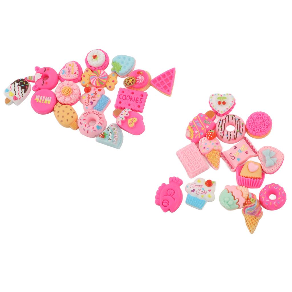 3. Material: Made of high quality ABS resin; 30 pieces of assorted desserts in any different designs and colors without glue.