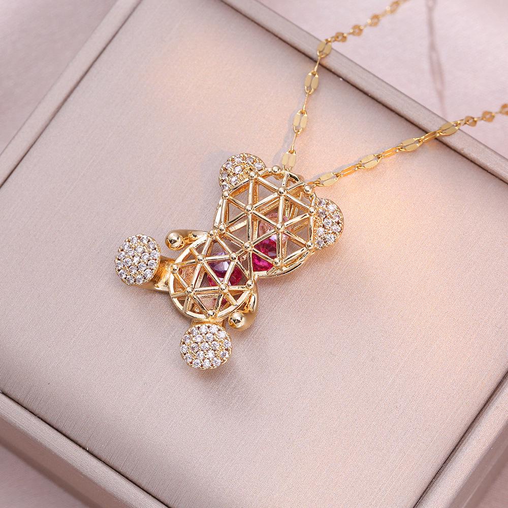 Damen Titanstahl Halskette mit goldenem Zirkonia, hohles Bär-Design, japanisch-koreanischer Stil, grenzüberschreitende Nischenmode.