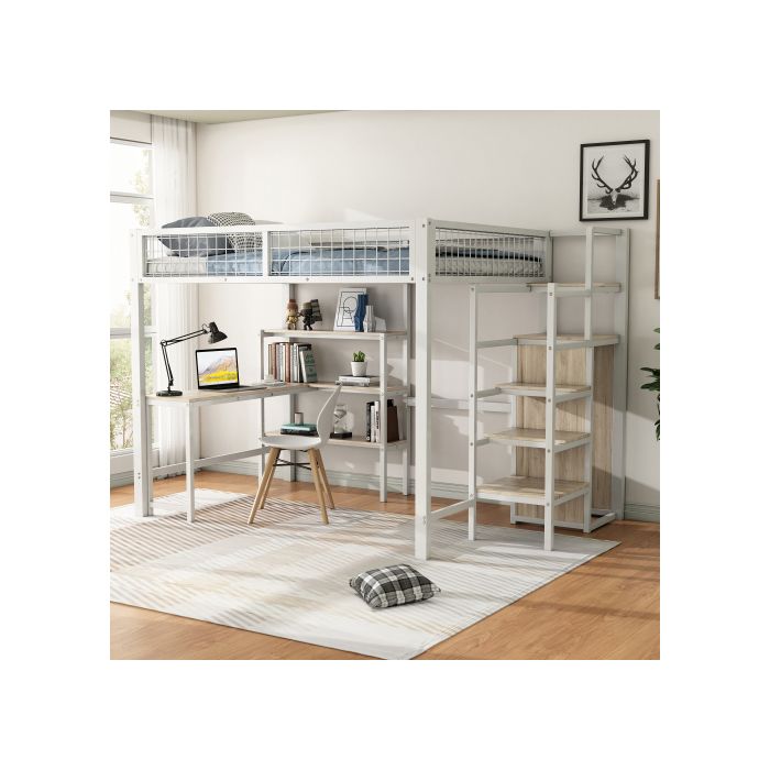 Lit mezzanine - MUVOE - 140x200 cm - Blanc - Armoire intégrée - Bureau spacieux