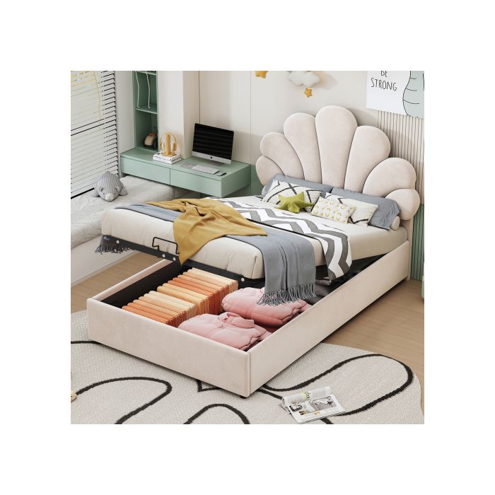 Lit d'enfant - MUVOE - 90 x 200 cm - Rembourré en velours - Tête de lit écrasée - Rangement intégré