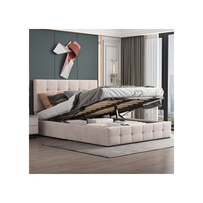 Gepolstertes Bett - MUVOE - 140x200 - Hydraulischer Klapp-Stauraum - Verstellbares Kopfteil - Cremefarbenes Samt
