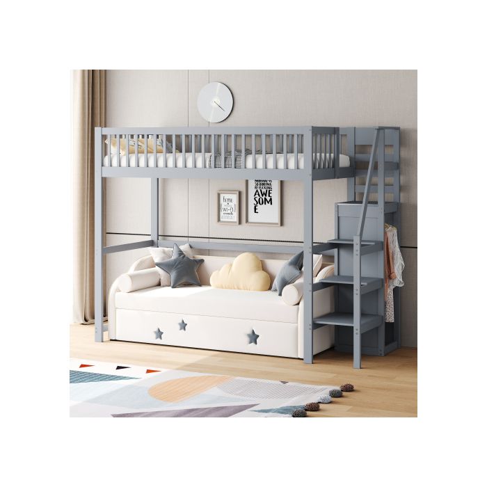 Lit mezzanine - MUVOE - 90x200 - Bois massif - Échelle de sécurité - Gris