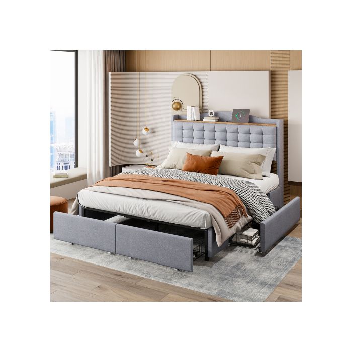 Lit capitonné - MUVOE - 140x200 cm - Tissu lin gris - 4 tiroirs - Port USB intégré