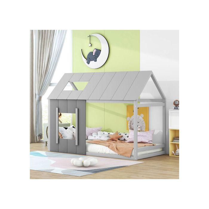 Lit d'enfant - MUVOE - 90 x 200 cm - Gris foncé + gris clair - Maison avec toit et fenêtre - Montage facile
