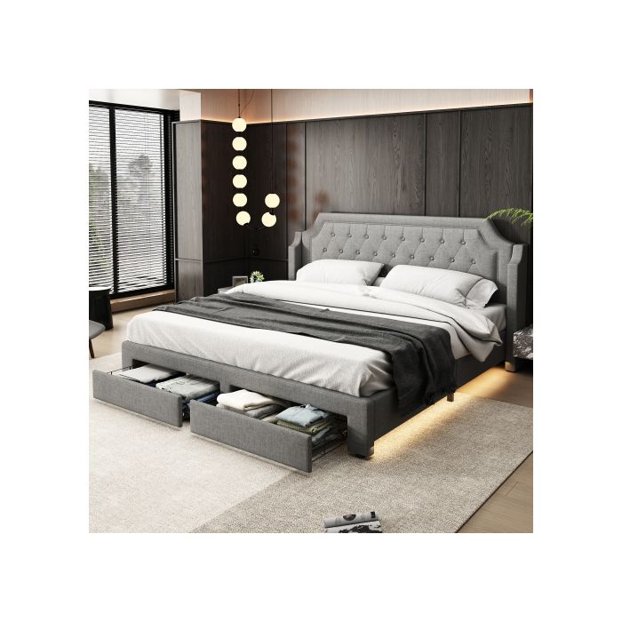 Lit rembourré - MUVOE - 180x200 cm - 2 tiroirs - Éclairage LED - Lin gris