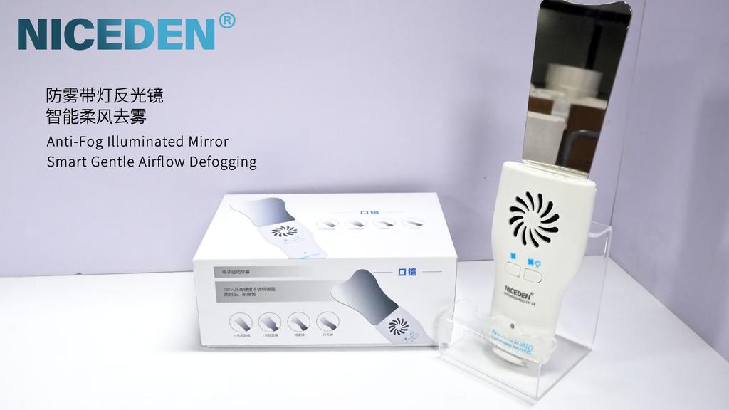 4.)Setzen Sie den Spiegel in die hintere Buchse des Hauptgeräts ein, drücken Sie die Lüftertaste, und ein Luftzug wird ausgeblasen, um die Spiegelfläche zu entnebeln.. Wenn die Helligkeit nicht ausreicht, aktivieren Sie die Beleuchtungsfunktion. (Hinweis: Zusätzliche Klarstellung basierend auf der Gerätefunktionalität, da der Originaltext hier eine geringfügige Auslassung enthält).
