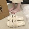 2025 neue flauschige Hausschuhe Damen tragen flache Sohle Samt Internet-Berühmtheiten rutschfest Wortkreuz Metallschnalle Retro Baumwollmopp
