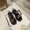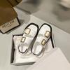 Schwarz Weiß Leder Sandalen Sommer Damen Schuhe Eckige Zehenpartie Flache Sandalen Dicke Sohle Metall Quadratische Schnalle Mode Einfache Sandalen