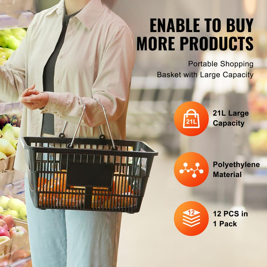 SucceBuy 12PCS Shopping Basket 21L with Metal Handle & Stand Portable Plastic Shop Grocery Basket for Store Supermarket Grocery