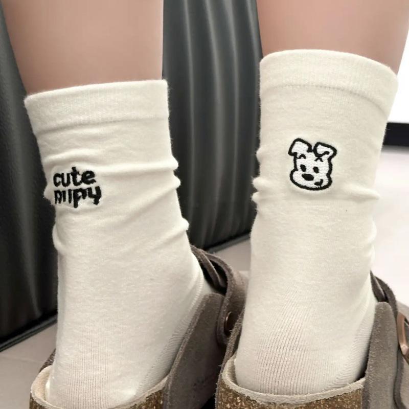 Damen Frühling und Herbst Ferse Bestickt Cartoon Welpe Buchstaben AB Stil Mittelhohe Gerippte Socken