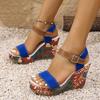 2025 neue europäische und amerikanische Mode bedruckte runde Zehenpartie Ein-Wort-Schnalle Damen Freizeitschuhe Übergröße Keilsandalen