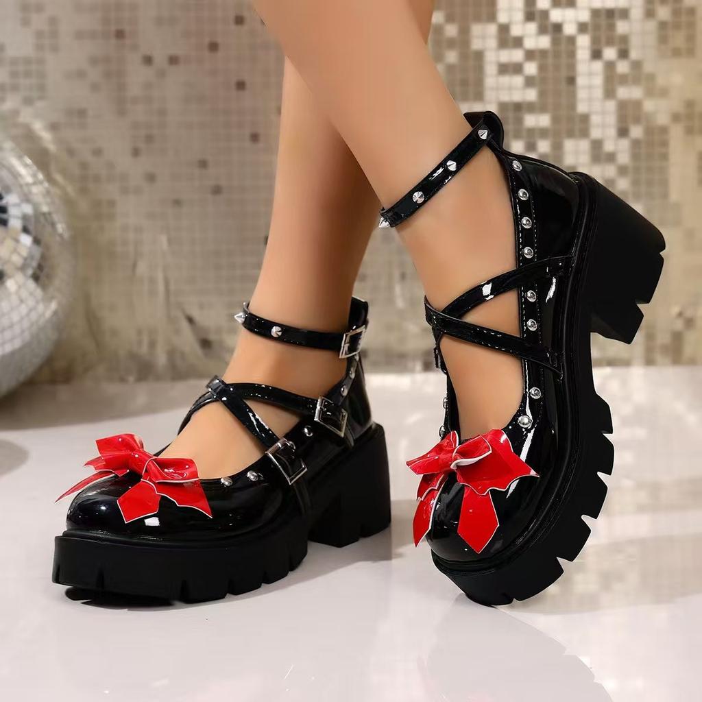 Mode Neue Damen Mary Jane Schuhe für Damen Knöchelriemen Lolita Schuhe Plateau Leder Schleifen Punk Gothic Klobige Absatz-Sneakers Femme