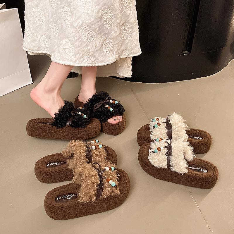 Dicke Plüsch-Pantoffeln mit dicker Sohle für Damen zum Tragen im Freien Herbst und Winter 2025 neue Mode draußen kleiner Muffin-Rolle Plüsch-Baumwoll-Mopp