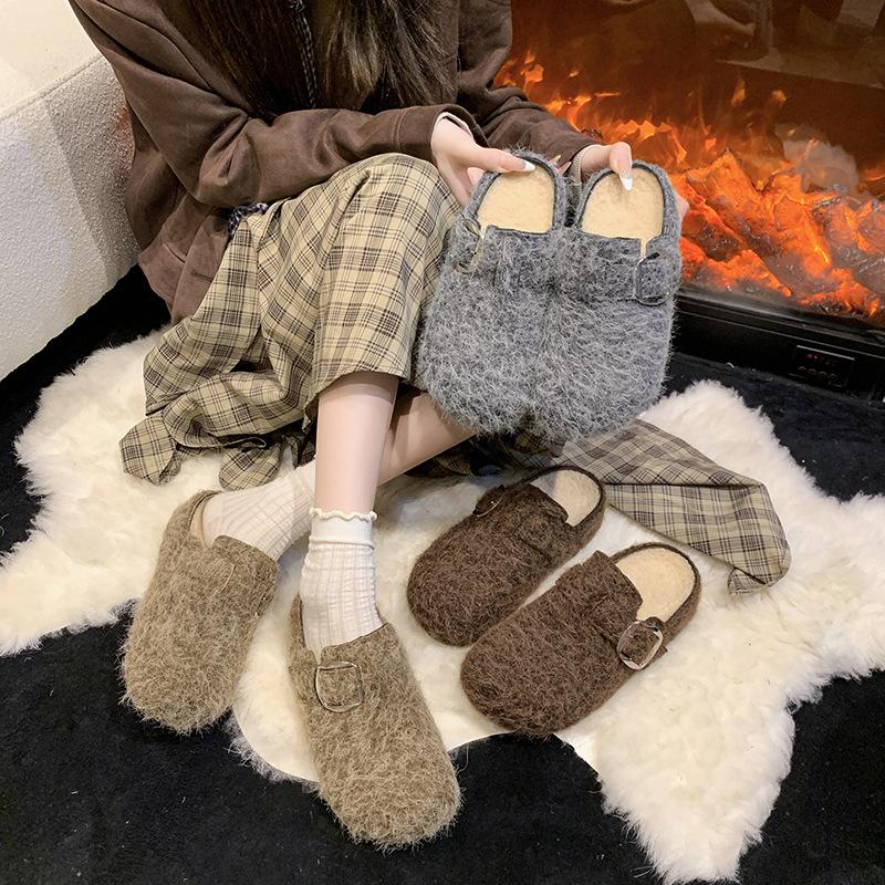 Retro Filz Dicksohlige Taschenkopf Halbschuhe Damen Außenbekleidung 2025 Herbst und Winter Neue Samt High-End Muller Baumwollpantoffeln