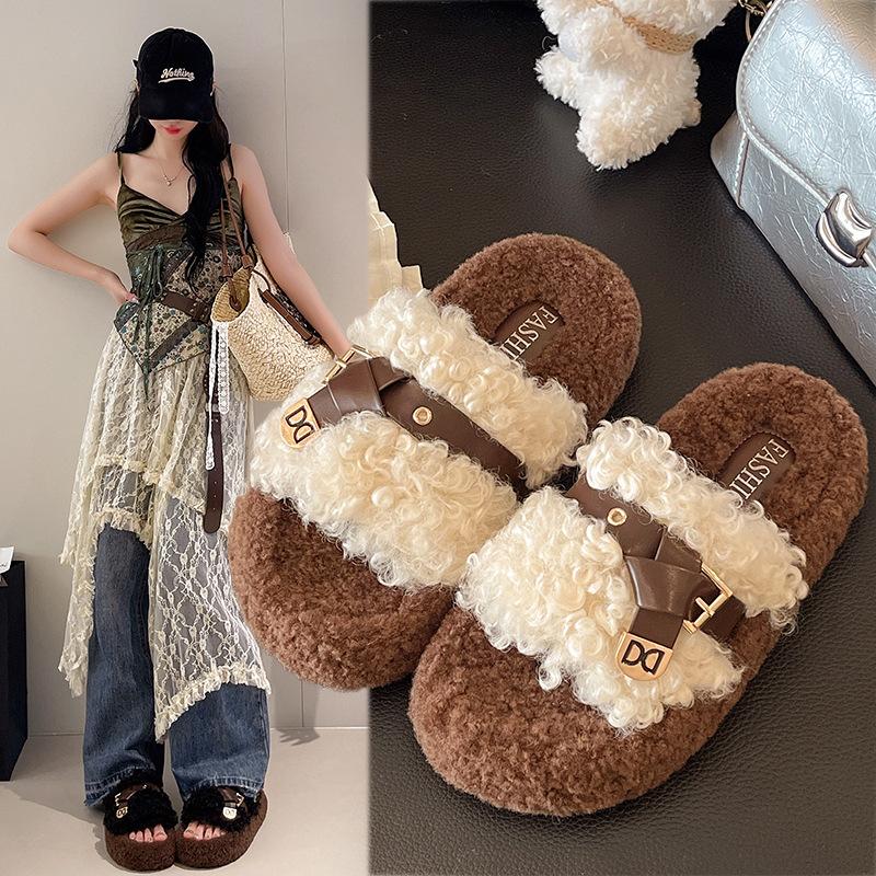 Retro Dicksohlige Flauschige Hausschuhe Damen 2025 Herbst Neue Mode Ein-Wort-Hausschuhe, Ausländischer Stil Erhöht und Schlankmachende Hausschuhe