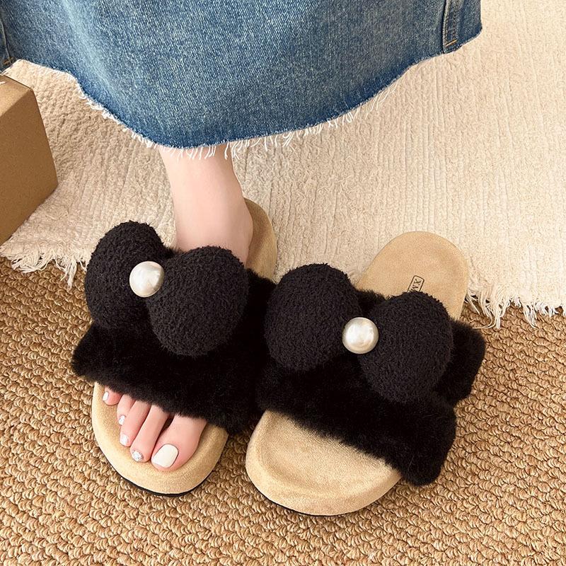 Perlen Schleife flauschige Hausschuhe Damen Herbst und Winter neu Zuhause Holzboden Wochenbett Plüsch Ein-Wort Baumwollhausschuhe