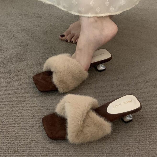 High-End High-Heel Temperament Flauschige Hausschuhe Damen Herbst und Winter Eckiger Kopf Dicker Absatz Fee Nische Rock Abend-Sandalen