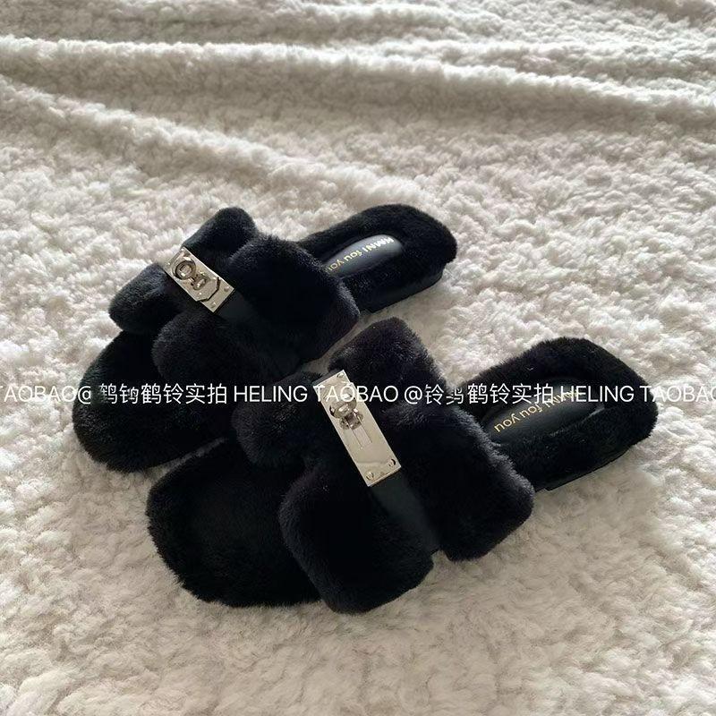 Internet-Berühmtheit flauschige Hausschuhe Damen tragen 2025 Herbst und Winter neu dicksohlige Ein-Wort-Schlepp kleine duftende Trend Plüschhausschuhe