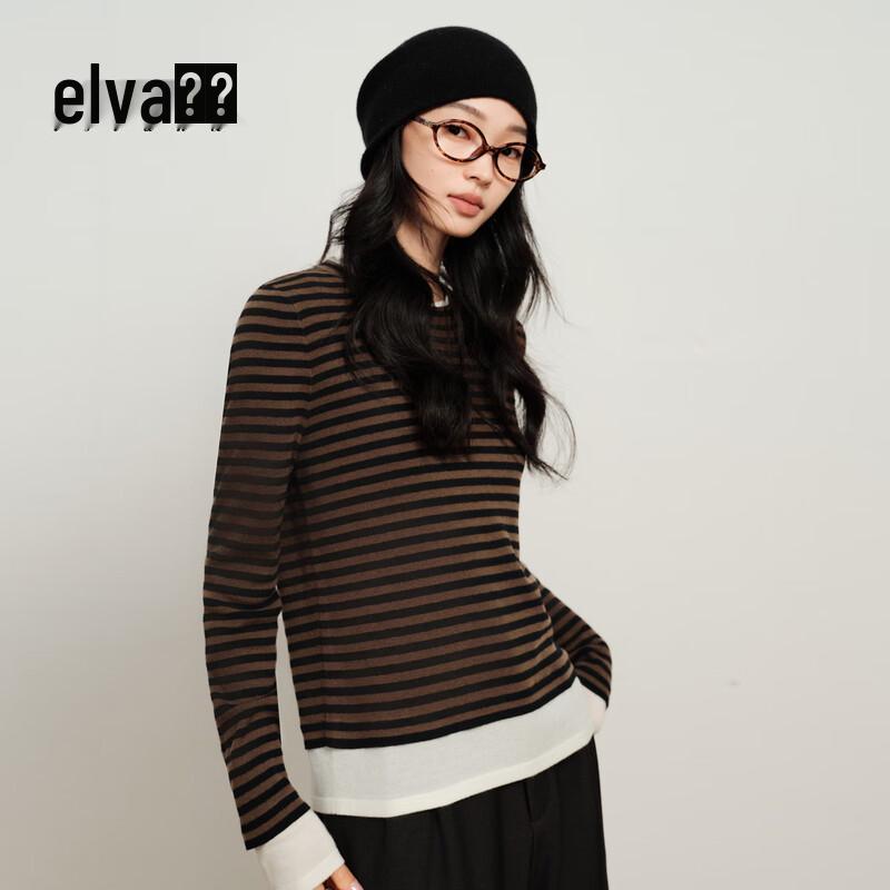 Elva' Island Women's Coffee Stripe Faux Two-Piece Knit Sweater