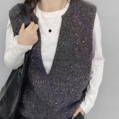 Tiefer V-Ausschnitt Saubere Version Pailletten Strickweste Layering Weste Damen Pendeln Lässig Vielseitiges Westen-Top