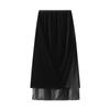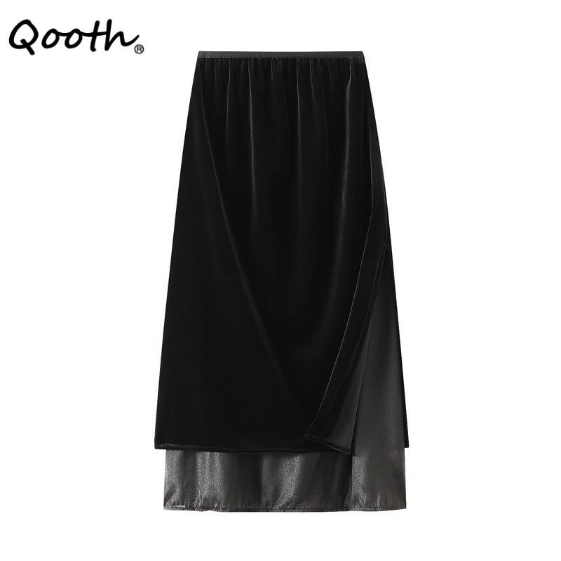 Qooth Women Velvet Split Splicing Skirt Mid Length Elastic Waist Casual Skirt QT2733