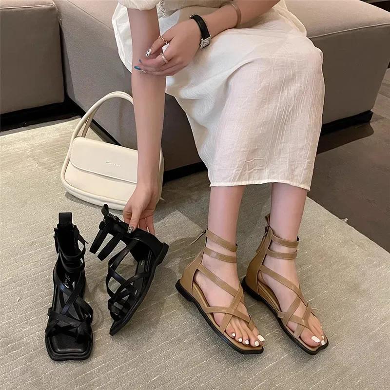 Mode Hochhackige Sandalen Neue Modische Vielseitige Eckige Zehenpartie Überkreuzte Riemchen Zehenfrei Flache Römische Damenschuhe