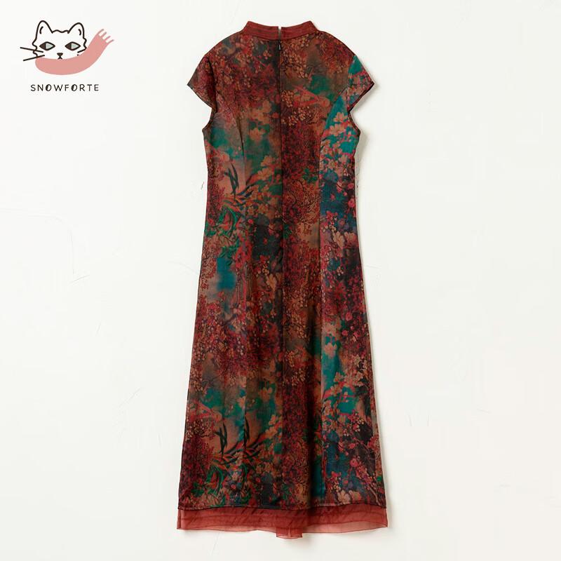 Sinuofude 100% Mulberry Silk Stand-Collar Short-Sleeve Long Dress