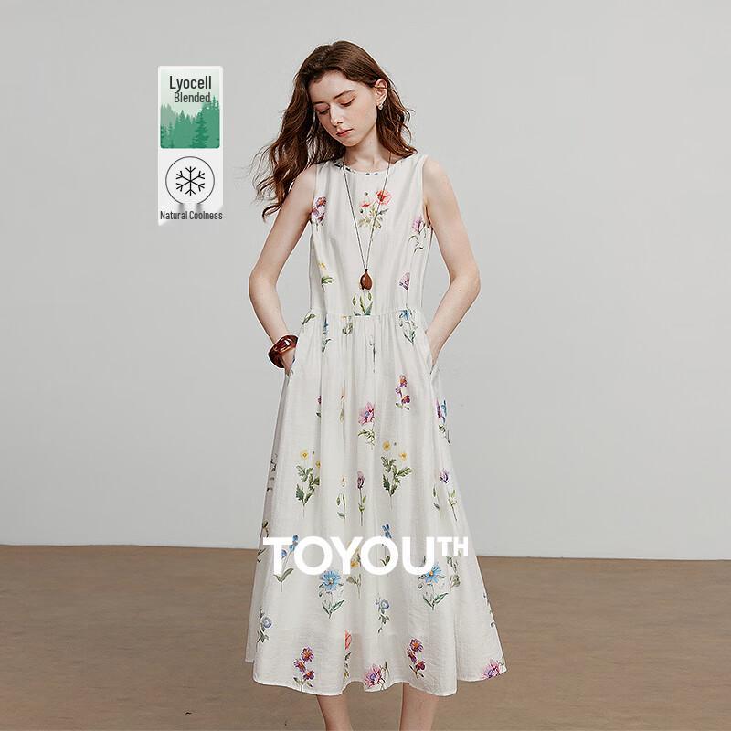 Chuyu Women's Resort Floral Print Round Neck Midi Dress