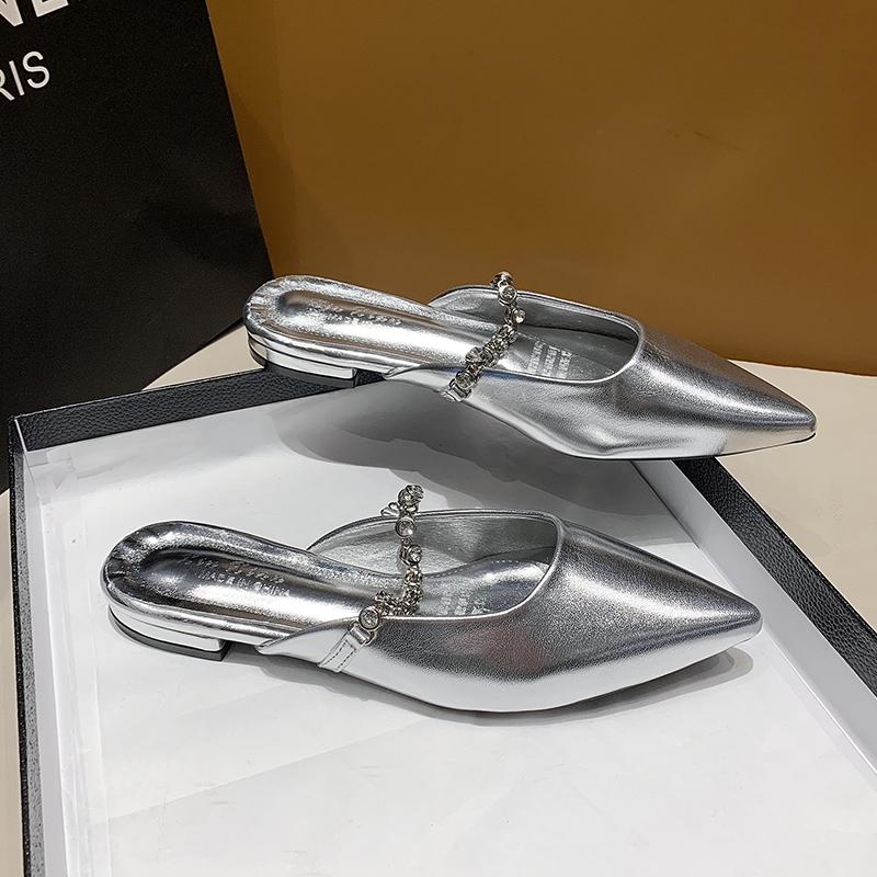 Neuer Stil Beliebte Designs Luxus Damen Pantoletten Elegante Slipper Niedrige Absatzsandalen Goldene Damen Hausschuhe Spitzschuhe für Damen