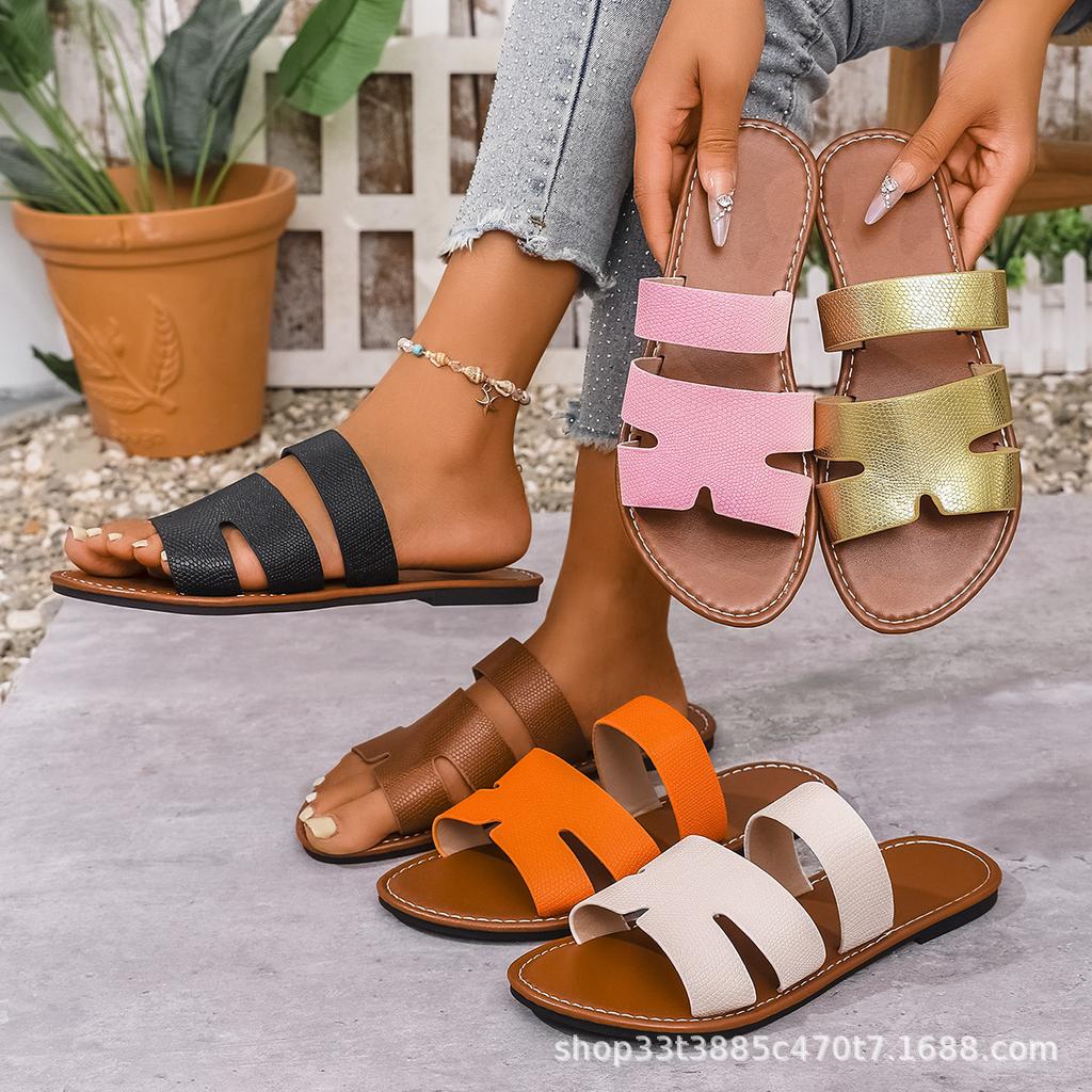 Damen Ein-Wort-Sandalen mit flachem Boden 2025 große Größe Sommer neu runder Kopf bequem flacher Boden Ein-Pedal coole Hausschuhe