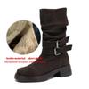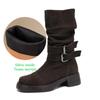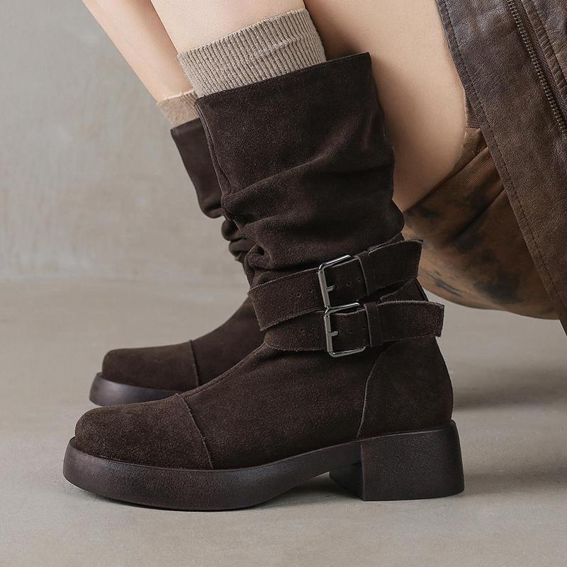 Krazing Pot Cow Suede Nubuck Winter Round Toe Modern Boots Med Heels Slip on Pleated Style Metal Buckle Mid-calf Boots