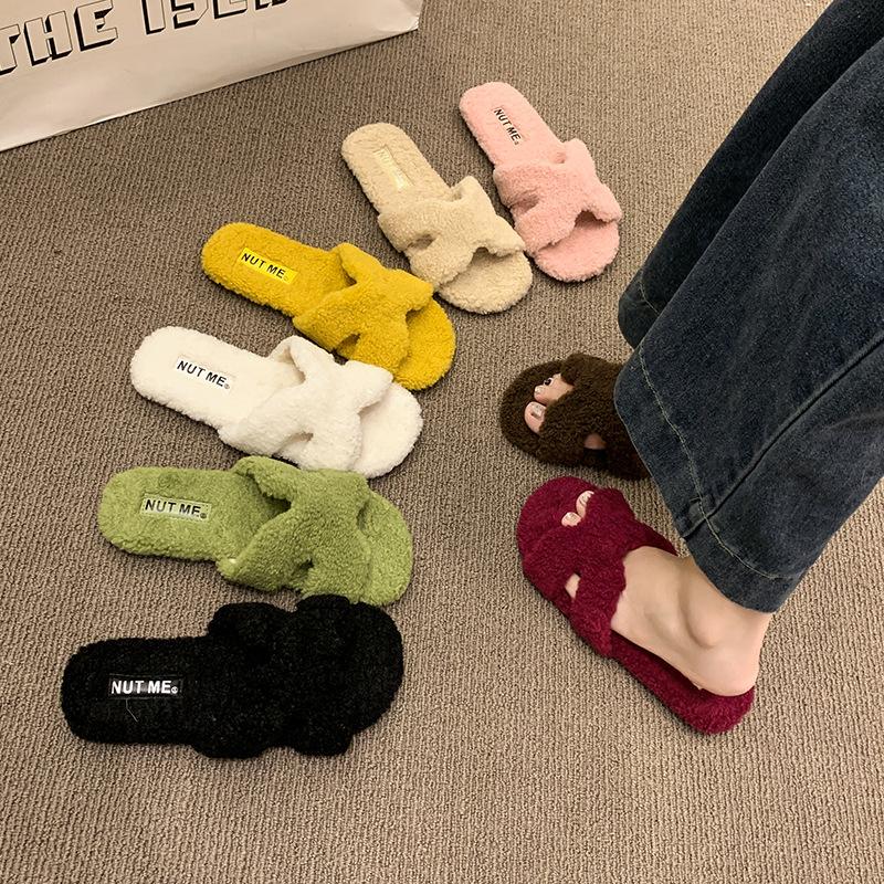 Internet-Berühmtheit flauschige Hausschuhe Damen tragen 2025 Frühling und Herbst neu flauschige Baumwoll-Schlepp flache Sohle warme Hausschuhe