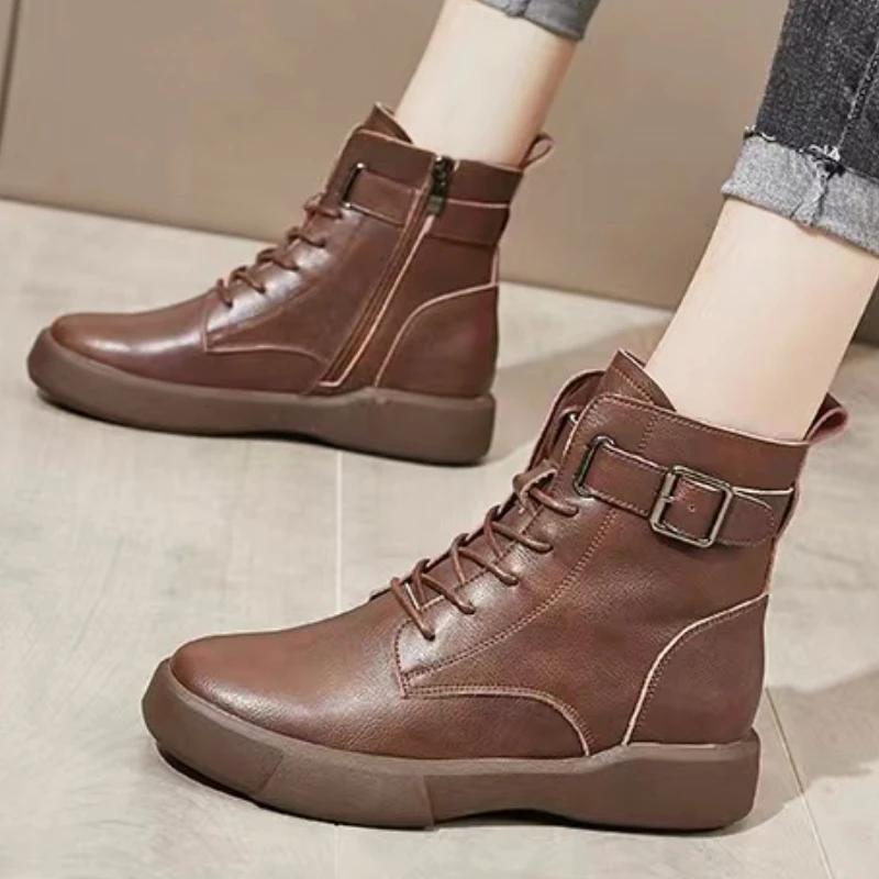 Damen Schnürstiefeletten Britischer Stil Runde Spitze Dicke Sohle Schuhe Gürtelschnalle Seitlicher Reißverschluss Lederstiefel Botas Para Mujeres