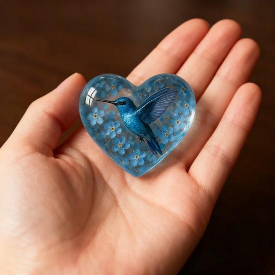 Symbolische Gelassenheit und Ewige Liebe: Geschmückt mit einem lebhaften Kolibri inmitten von Vergissmeinnicht-Blüten, symbolisiert dieses Andenken Erinnerung, ewige Verbundenheit und friedliche Gedanken – ein von Herzen kommendes Emblem der Liebe, die die Distanz überwindet.