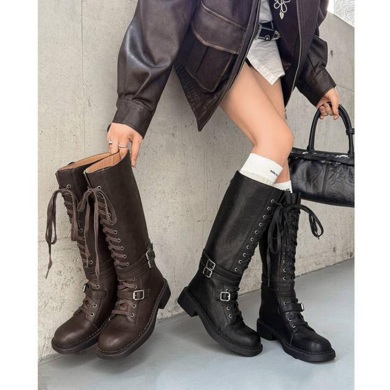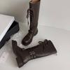 Herbst- und Winter Damen Leder Ritterstiefel dicksohlige rutschfeste Gummisohle Schnürung mittlerer Absatz Übergröße Damenstiefel neue hohe Stiefel