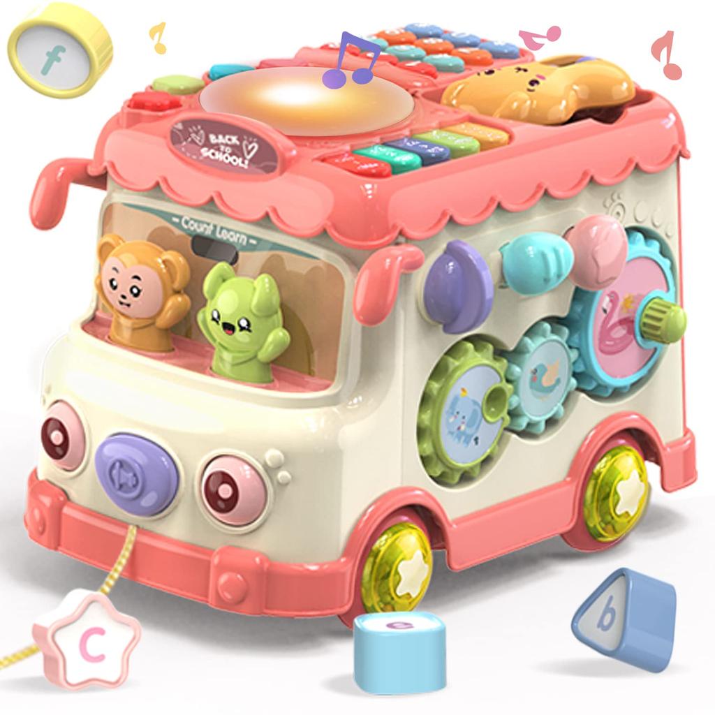 [Setinhalt] Multifunktionaler Musikbus (eine Kombination aus einem Musikinstrument-Spielzeug und einem busförmigen Lernspielzeug. Ein Spielzeug mit verschiedenen lustigen Funktionen wie rhythmischer Musik, Lichtern und Formensortieren.) x 1, Farbe: Rosa, Körpergröße: 27 x 19 x 17 cm.
