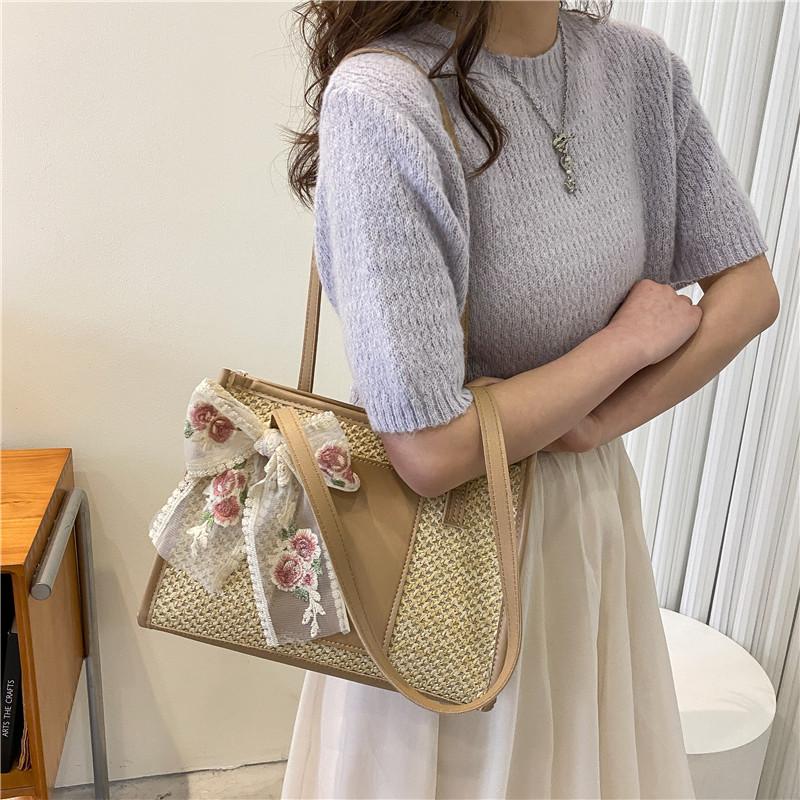 Internet celebrity spring bag women's 2025 new fashion woven shoulder bag large capacity casual contrasting straw tote bag