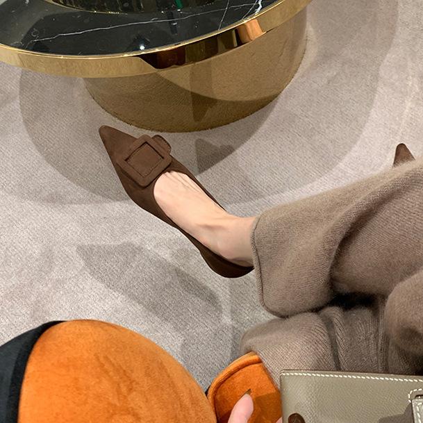 Schafsleder-Version~ Französische quadratische Schnalle Leder weiche Sohle Mary Jane Einzelschuhe Damen schöne kleine Absätze flache spitze Schuhe Damenschuhe