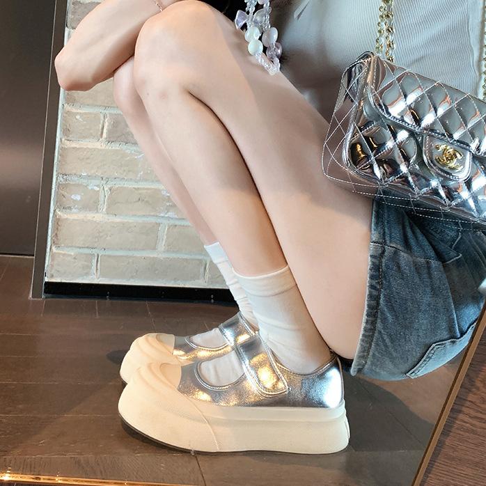 Rindslederversion~ Klettleder Ein-Pedal Dicksohlige Erhöhungsschuhe Silberne Mary Jane Einzelschuhe Muffin Weiße Schuhe