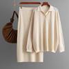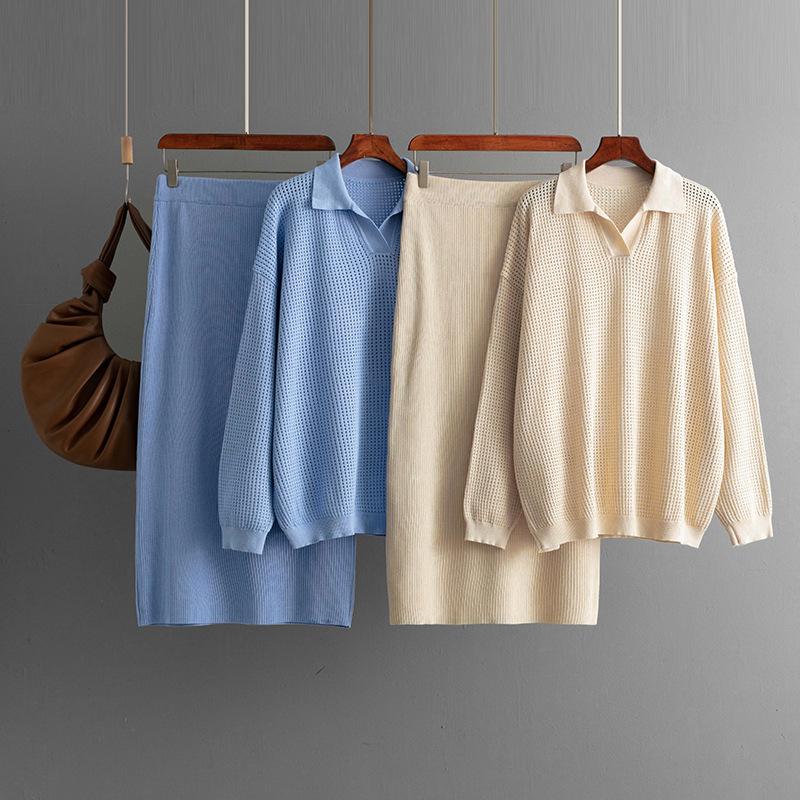 Herbst Neu Polo Ausgehöhlt Gestrickt Langärmeliges Oberteil Einfarbig Rock Zweiteiliges Set für Damen