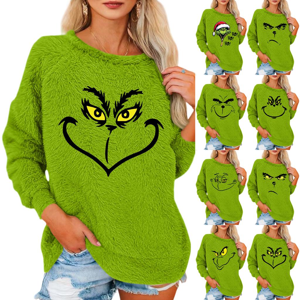 Damen Modischer Rundhals Langarm Weihnachts-Print Lockerer Plüsch Warmer Pullover