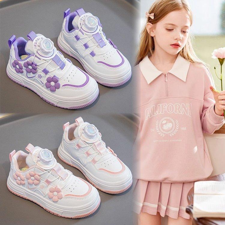 Mädchen-Sneaker 2025 Frühling neu drehbarer Knopf lässige Mädchen-Board-Schuhe Mode Blume Kinder-weiße Schuhe